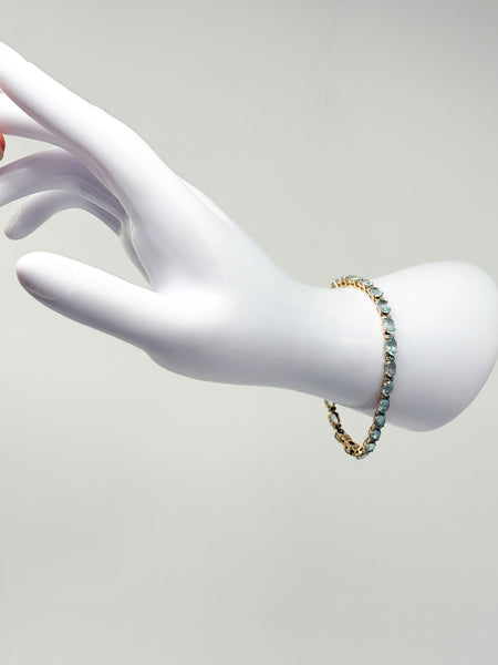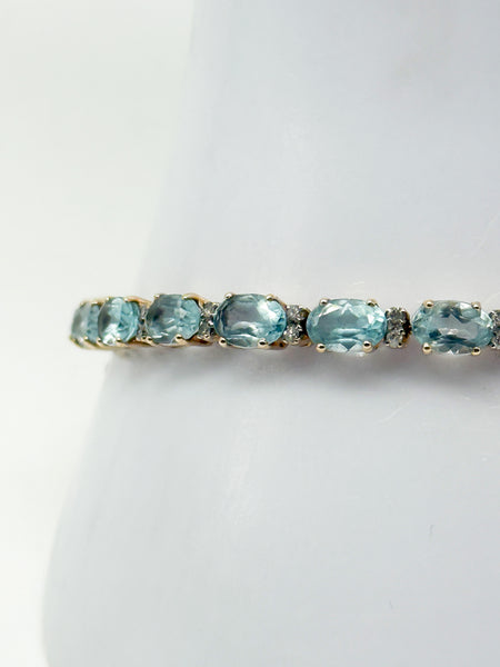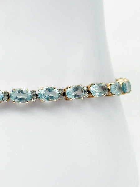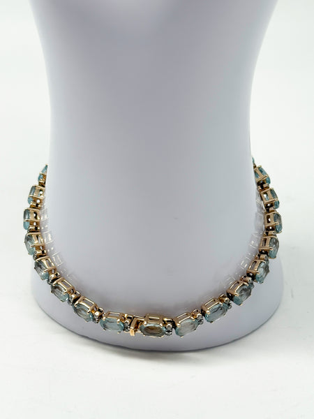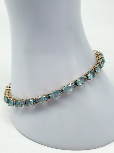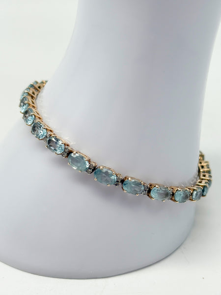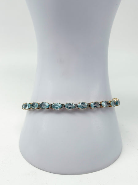 Besonders eindrucksvoll sind die 25 natürlichen Aquamarine, die in Krallenfassung sorgfältig eingefasst sind. Jeder Stein misst 6 x 4,25 mm und bringt ein Gesamtgewicht von 25,5 ct mit. Die blaue Farbe der Aquamarine verleiht dem Armband eine frische, elegante Ausstrahlung und lässt es sowohl zu festlicher Kleidung als auch im Alltag zu einem stilvollen Blickfang werden. Die ovale Form der Steine und die präzise Verarbeitung unterstreichen die edle Handwerkskunst und lassen das Schmuckstück im Licht funkelnd erstrahlen.