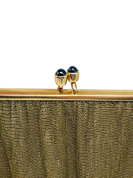 Besonders hervorzuheben sind die verarbeiteten Saphire im Cabochon-Schliff mit einem Durchmesser von ca. 4,4 mm und einem Gesamtgewicht von ca. 1 ct, die der Tasche einen luxuriösen Akzent verleihen. Die goldfarbene Ausführung und das Kettenmuster runden das edle Erscheinungsbild harmonisch ab.