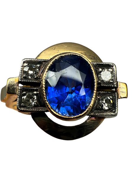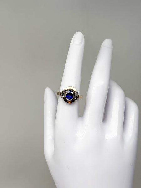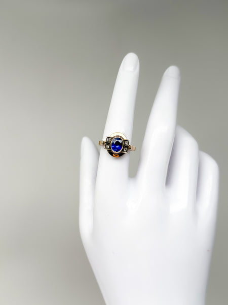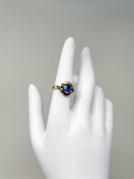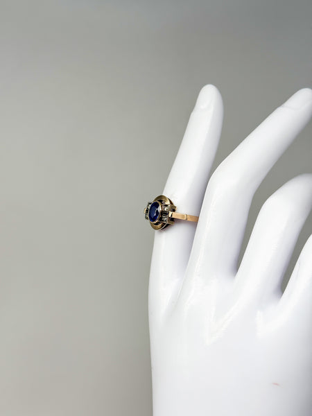 Dieser edle Ring aus 14 Karat Gelbgold vereint klassische Eleganz mit einer ausdrucksstarken Edelsteinkombination. Im Mittelpunkt steht ein natürlich entstandener, oval geschliffener Saphir in tiefem Blau, der mit seinen Maßen von ca. 7,2 x 5,5 mm sofort ins Auge fällt. Seine intensive Farbe verleiht dem Ring eine luxuriöse Ausstrahlung und macht ihn zu einem stilvollen Begleiter für besondere wie auch alltägliche Momente.