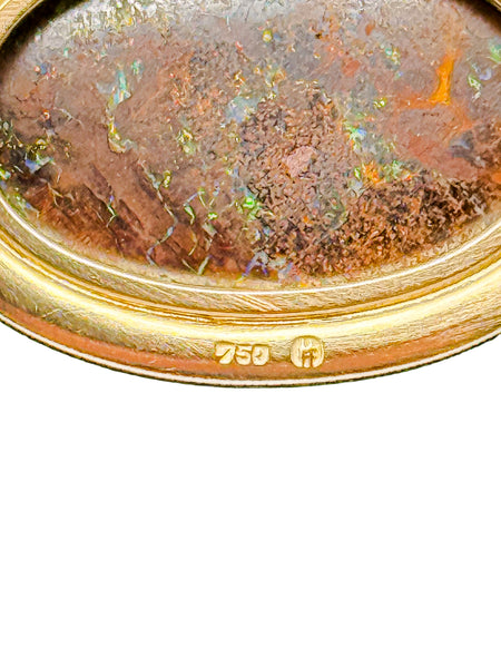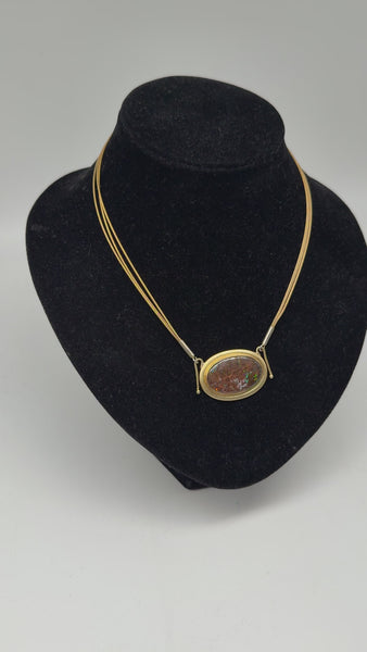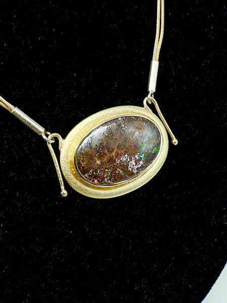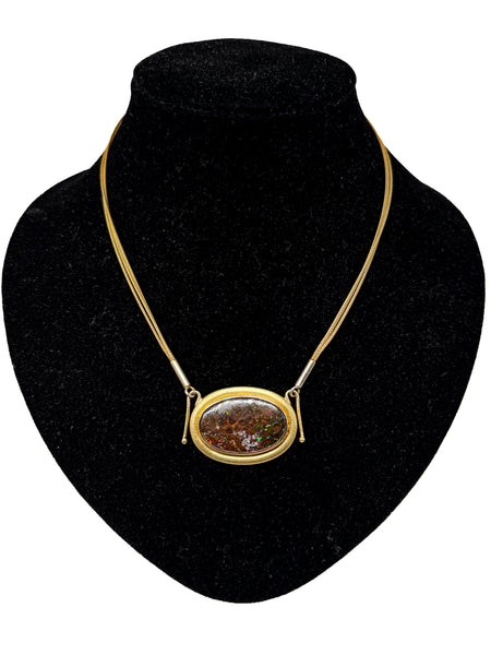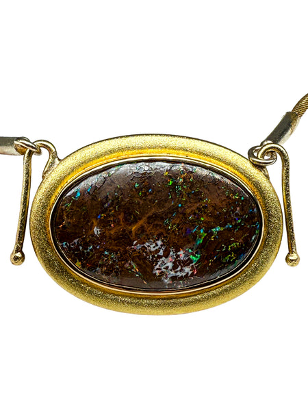 Ein exklusives Collier aus 18 Karat Gelbgold, das durch seinen prachtvollen Oval-Opal (Cabochon) besticht. Der Opal in mehrfarbiger Leuchtkraft (50 ct) zieht alle Blicke auf sich und verleiht jedem Outfit einen Hauch von Luxus.
