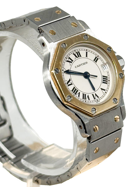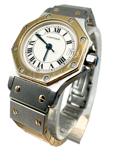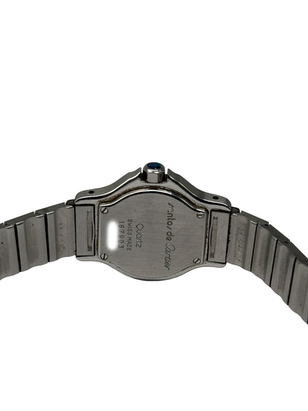 Zum Verkauf steht eine elegante Damenarmbanduhr Cartier Santos – ein ikonisches Luxusmodell mit zeitloser Ästhetik und klassischer Linienführung.