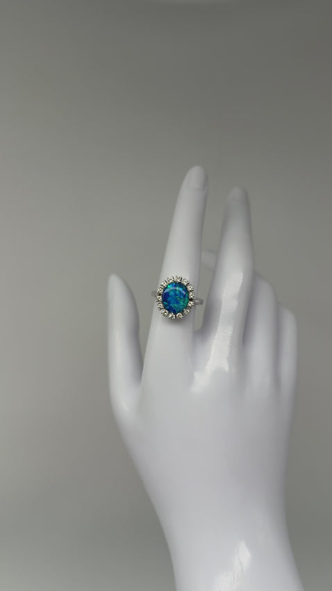 Der Opal, mit einem beeindruckenden Gewicht von 3 Karat, bildet das leuchtende Zentrum dieses einzigartigen Rings. Sein zartes blaues Farbspiel entfaltet sich je nach Lichteinfall in lebendigen Nuancen und verleiht dem Schmuckstück eine magische Tiefe. Mit einer Länge von 12 mm und einer Breite von 10 mm besitzt der Edelstein eine elegante Größe, die seine Schönheit eindrucksvoll zur Geltung bringt, ohne aufdringlich zu wirken. Umgeben wird der Opal von fein gearbeiteten Diamanten mit einem Gesamtgewicht von 0,65 Karat, deren funkelnde Brillanz einen faszinierenden Kontrast zu den sanften Farbreflexen des Opals bildet.