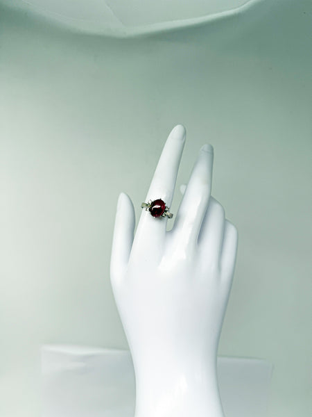Um den Hauptstein herum funkeln vier Diamanten mit einem Gesamtgewicht von 0,12 ct, die in Krallenfassung gesetzt sind und das Licht auf elegante Weise einfangen. Das Zusammenspiel von Rubinglanz und Diamantfeuer verleiht dem Ring eine exklusive Ausstrahlung, die klassische Schönheit und zeitlose Eleganz perfekt verbindet.