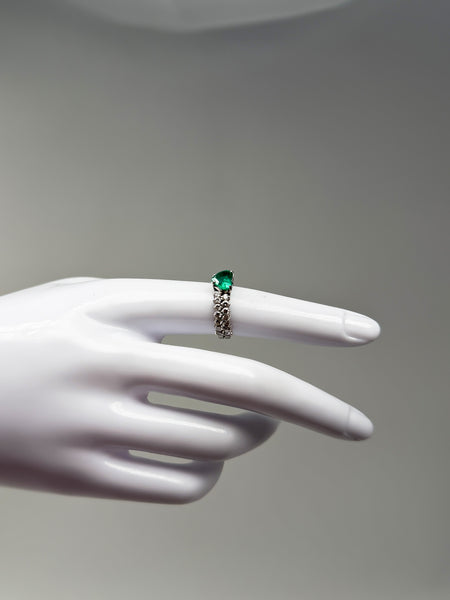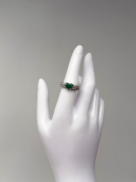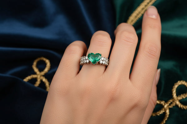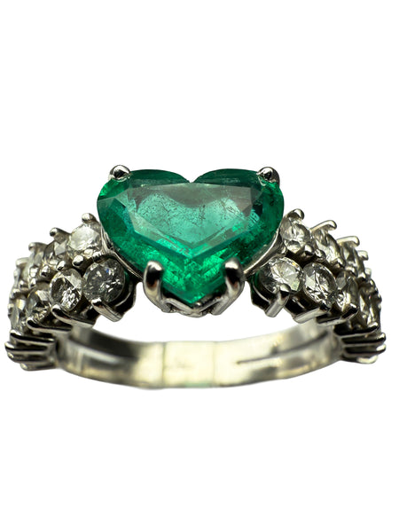 Dieser außergewöhnliche Ring aus 18 Karat Weißgold vereint zeitlose Eleganz mit hochwertiger Goldschmiedekunst und ist ein echtes Schmuckstück für besondere Momente. Im Mittelpunkt steht ein natürlicher Smaragd mit einem Gesamtgewicht von 1,143 ct, der durch seine intensive grüne Farbe sofort ins Auge fällt. Die Herzform des Ringkopfes verleiht dem Schmuckstück eine romantische und zugleich exklusive Ausstrahlung.