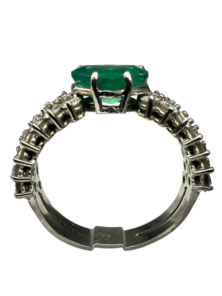 Der Smaragd ist sicher und stilvoll in einer Zargenfassung gefasst, die nicht nur Schutz bietet, sondern den Edelstein auch harmonisch zur Geltung bringt. Umrahmt wird der Hauptstein von 28 funkelnden Diamanten mit einem Gesamtgewicht von 1 ct, die dem Ring zusätzliche Brillanz und Luxus verleihen. Das Zusammenspiel aus dem kühlen Glanz des Weißgoldes, dem leuchtenden Grün des Smaragds und dem Funkeln der Diamanten macht diesen Ring zu einem eleganten Blickfang für jeden Anlass.