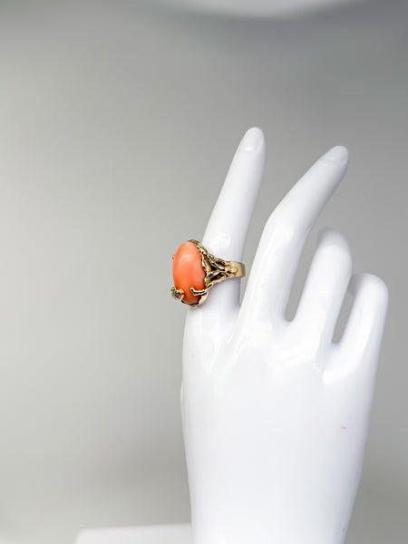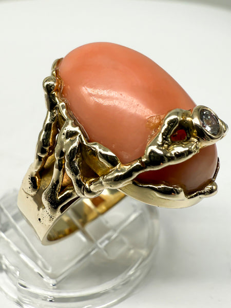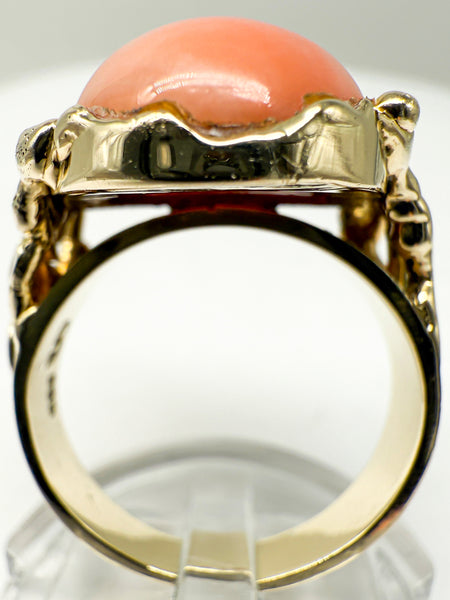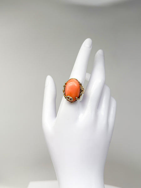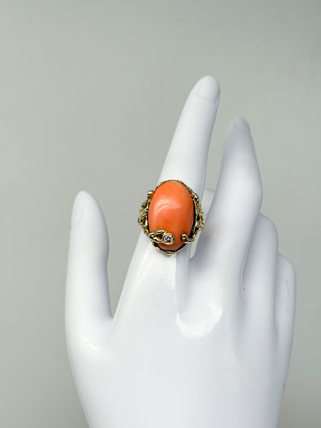Zum Angebot steht ein außergewöhnlicher antiker Ring aus 14 Karat Gelbgold, der durch seine imposante Gestaltung und die edle Kombination aus natürlicher Koralle und Diamant besticht. Dieses Schmuckstück vereint klassische Goldschmiedekunst mit einer ausdrucksstarken Farbwirkung und ist ein wahres Highlight für Liebhaber besonderer Vintage- und Antikstücke.