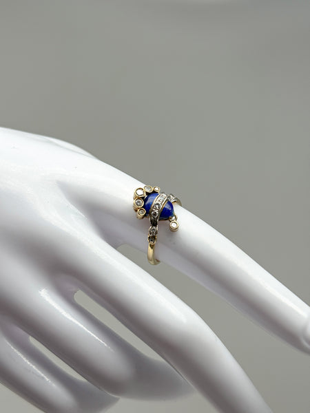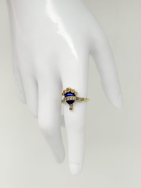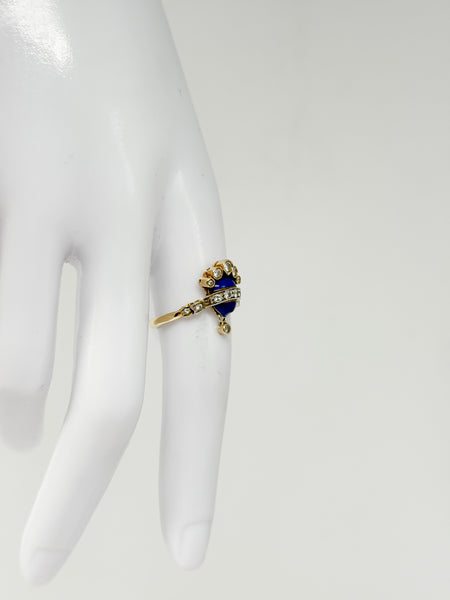 Dieser antike Ring aus 18 Karat Gelbgold vereint feine Handwerkskunst mit klassischer Eleganz. Das Design weist stilistische Ähnlichkeiten zu Fabergé auf, trägt jedoch keinen Stempel. Besonders hervorzuheben ist die kunstvolle Emaille-Arbeit, die dem Ring eine dekorative und zugleich außergewöhnliche Note verleiht.