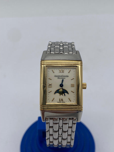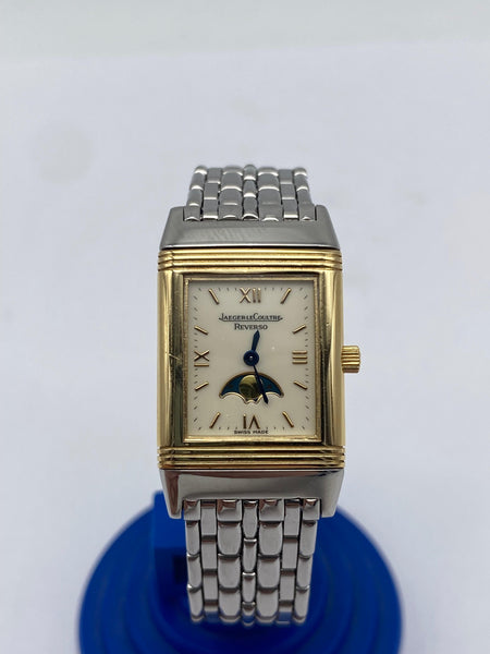 Die Reverso ist nicht nur für ihre hochwertige Verarbeitung bekannt, sondern auch für ihre einzigartige, wendbare Gehäusefunktion, die es ermöglicht, das Gehäuse zu drehen und auf der Rückseite einen Schutzdeckel zu präsentieren. Dies macht die Uhr nicht nur zu einem praktischen Begleiter, sondern auch zu einem modischen Statement. Das Zifferblatt in elegantem Goldton und mit römischen Ziffern ist klar und gut ablesbar, was die Uhr zu einem praktischen wie stilvollen Zeitmesser macht. Die Mondphase auf dem Zifferblatt ist eine der besonderen Funktionen dieses Modells und verleiht der Uhr eine zusätzliche Raffinesse.